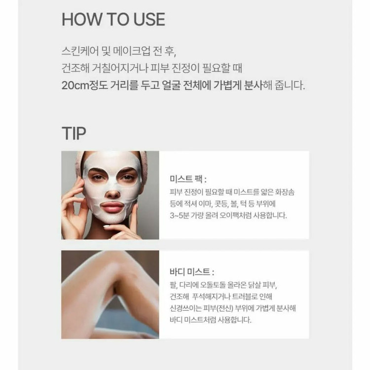 قبل و بعد از مراقبت از پوست و آرایش، زمانی که پوست خشک و زبر است یا زمانی که پوست نیاز به تسکین دارد، از فاصله حدود 20 سانتی متری به آرامی روی کل صورت اسپری کنید.