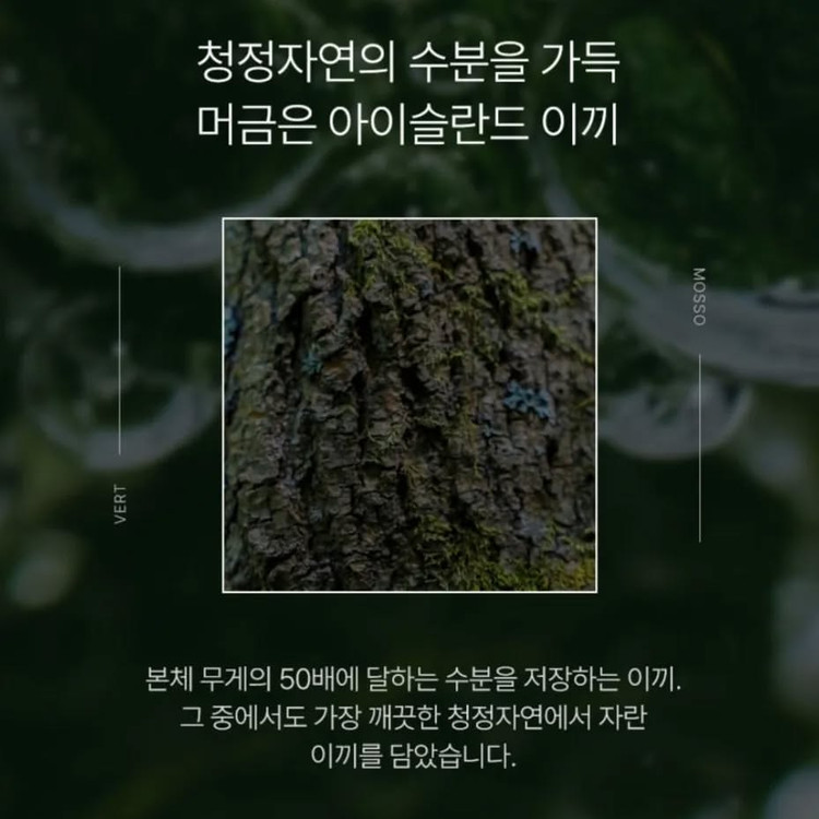 ساخته شده از خزه ایسلندی پر از رطوبت طبیعی خالص خزه تا 50 برابر وزن بدن خود رطوبت را ذخیره می کند. در میان آنها، خزه ای است که در تمیزترین طبیعت رشد کرده است.