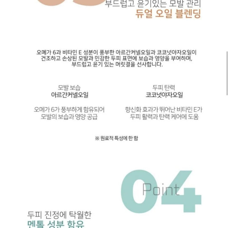 روغن هسته آرگان و روغن نخل نارگیل، غنی از امگا 6 و ویتامین E، موهای خشک، آسیب دیده و سطح حساس پوست سر را مرطوب و تغذیه می کند و موها را نرم و درخشان می کند