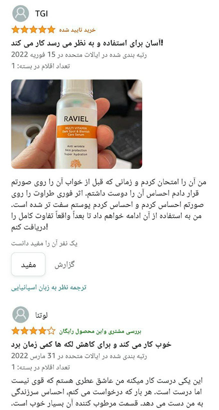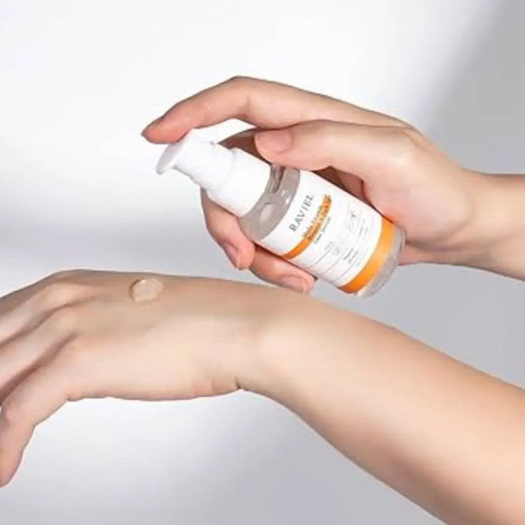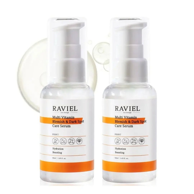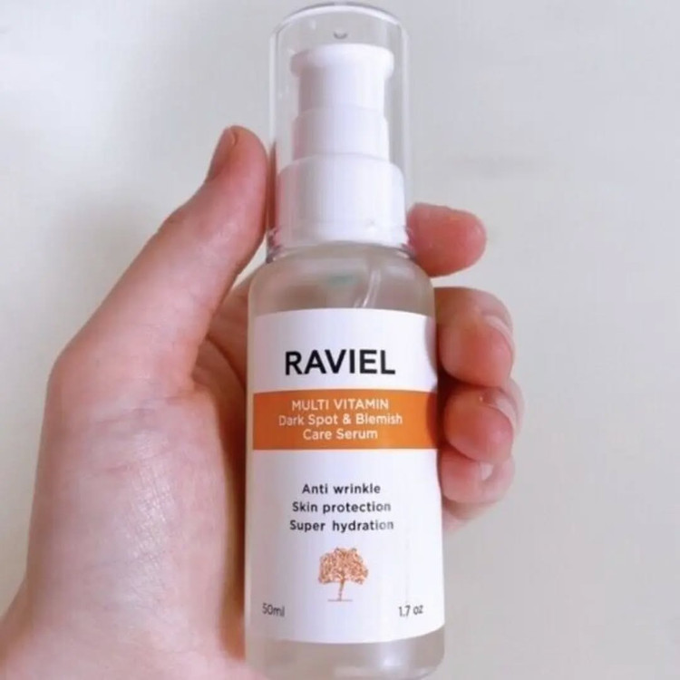 سرم مولتی ویتامین (ویتامین سی) روشن کننده و کمرنگ کننده جای جوش، یکدست کننده صورت، رفع چروک های ریز و کدری صورت و سفت کننده پوست همگی در یک محصول اونم از نوع سرم با بافت رقیق و سبک از برند raviel